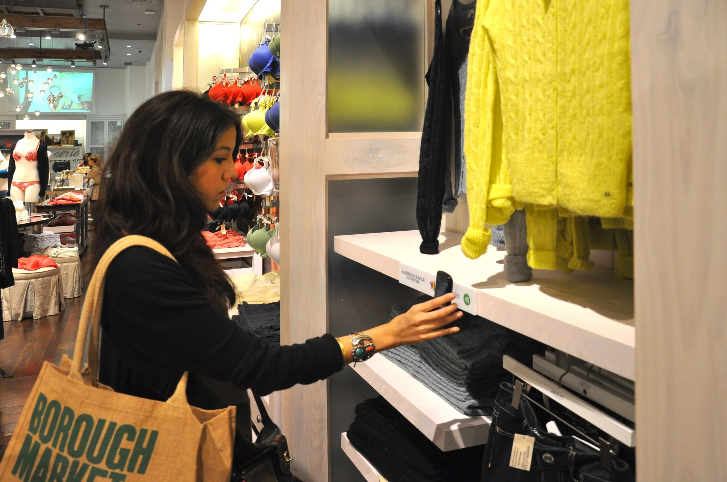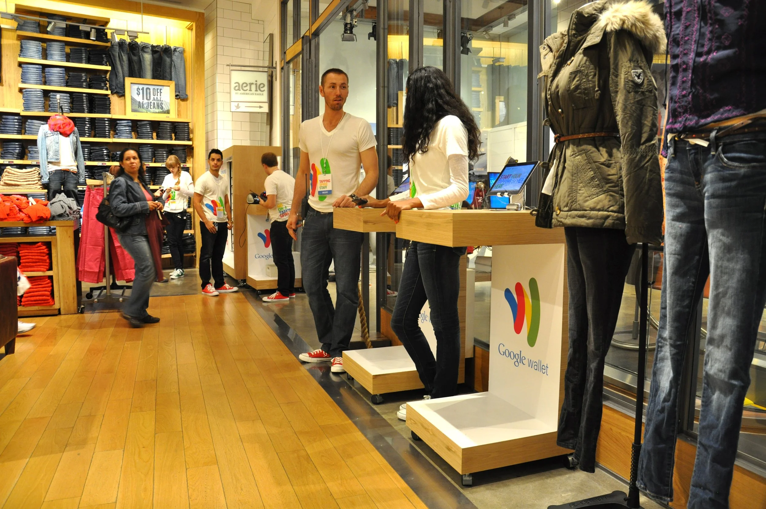 American Eagle and Google Chrome teamed up to display fashion merchandise alongside digital POS transactions. The launch was one of the biggest Chrome event ever thrown, occupying a vibrant corner of Times Square. Through a series of displays and signage, customers engage with search data and queries within the browser. Life-size demos capture exciting interior activity and trend-setting sale models adorn the store's modern interiors.